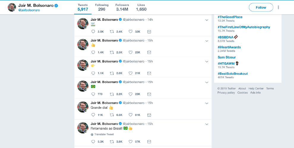 網友Jair M. Bolsonaro總統在twitter比讚