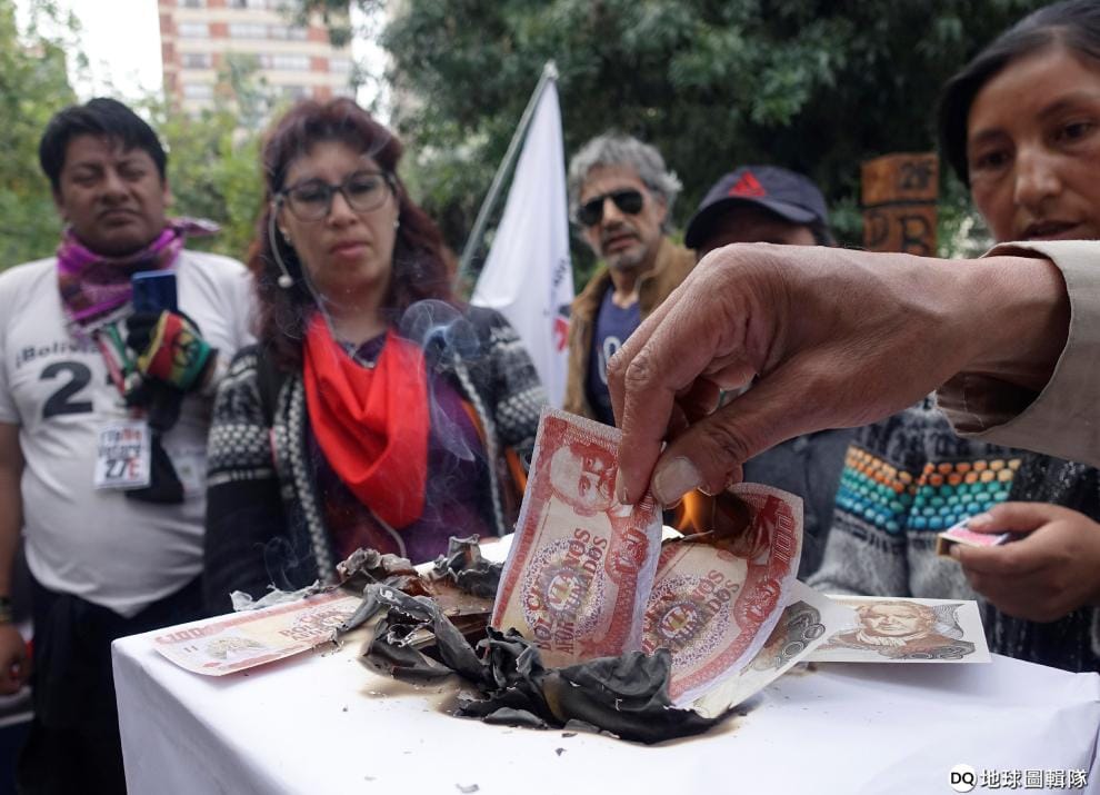 在首都拉巴斯(La Paz),反對派人士一邊燒假鈔,一邊將假鈔投進自製投票箱中,藉此抗議即將到來的總統大選太花錢。