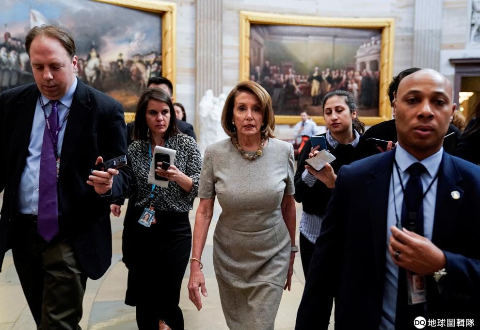 25號這天,身穿灰色洋裝的美國眾議院議長裴洛西(Nancy Pelosi)在眾人簇擁下準備返回辦公室。不久前,美國總統川普(Donald Trump)決定暫時先放下與參眾議院的美墨圍牆預算案爭議,宣布重啟美國政府三周,這也被視為他與裴洛西的休戰。