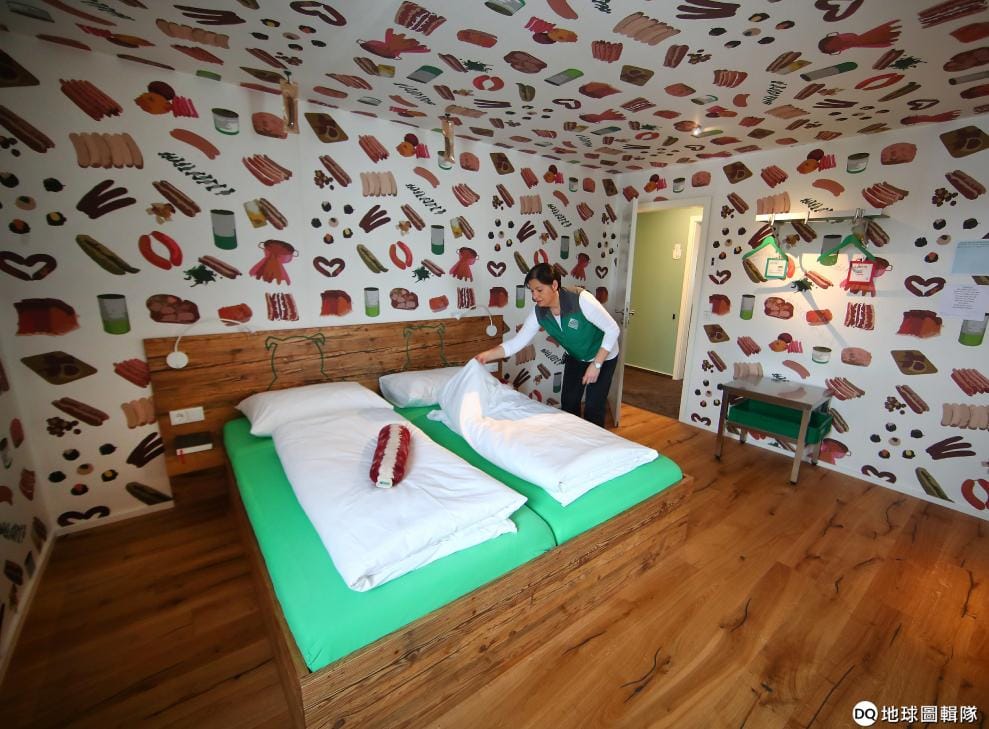 在紐倫堡附近的Rittersbach,當地開了一間香腸大飯店,裡頭除了有臘腸圖案的壁紙、臘腸造型的枕頭,就連浴室中的肥皂都是香腸的形狀,吸引不少愛肉人士一探究竟。