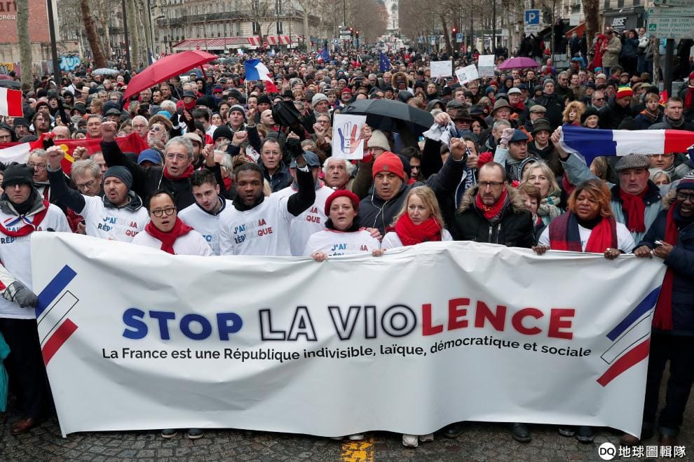 在巴黎街頭,反對「黃背心運動」(yellow vests movement)出現暴力行為的民眾,戴起紅圍巾上街表達訴求,只見他們手拿寫有「停止暴力」字樣的布條遊行。