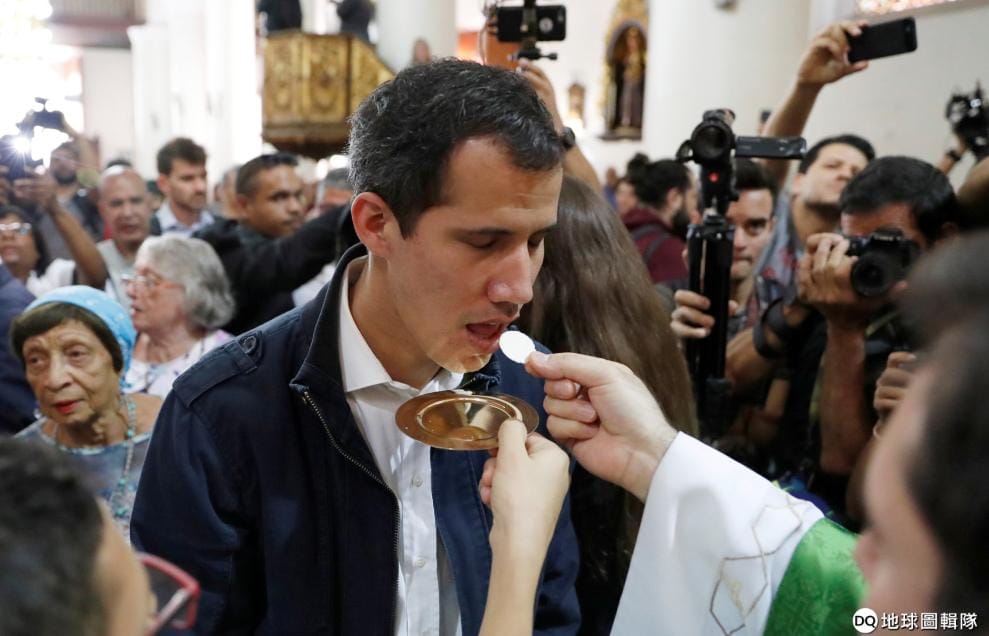 在首都卡拉卡斯,自封為臨時總統的蓋多(Juan Guaidó)在望彌撒時接受聖餐禮。
