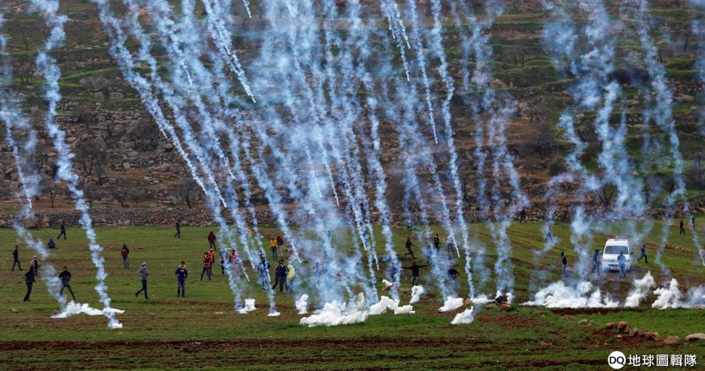 在以色列佔領的約旦河西岸,以色列軍隊朝巴勒斯坦示威民眾發射催淚瓦斯,煙霧從天而降的場景令人心驚。