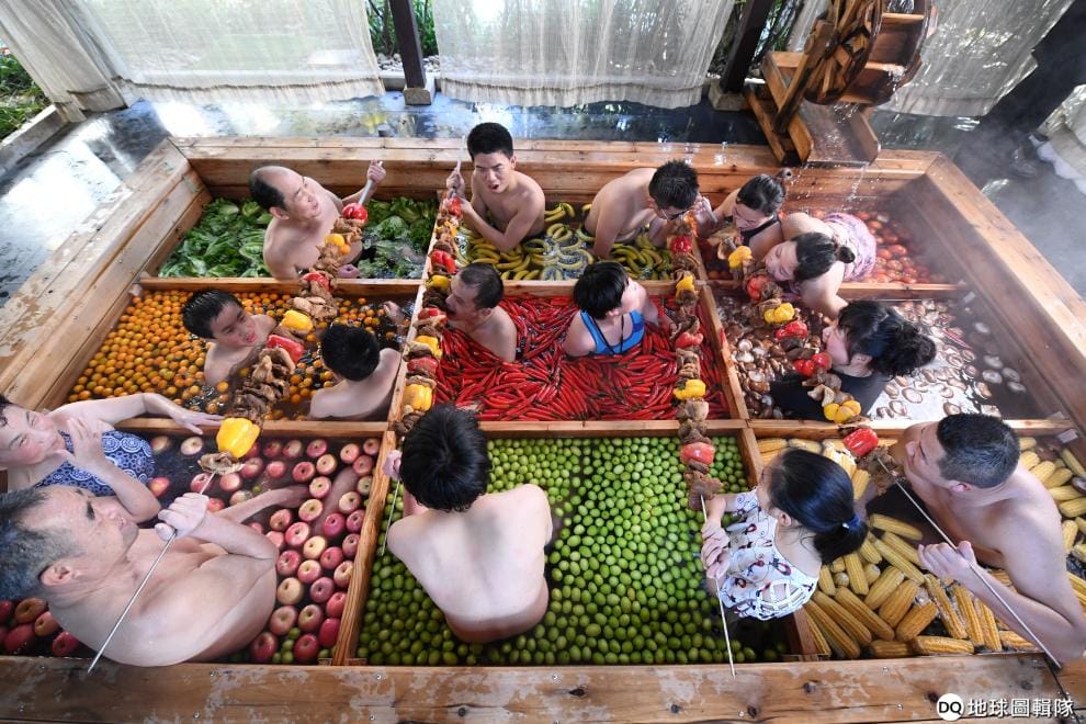 在浙江省杭州市的一座飯店內,人們一邊泡在充滿蔬果的溫泉中,一邊大啖烤肉串。
