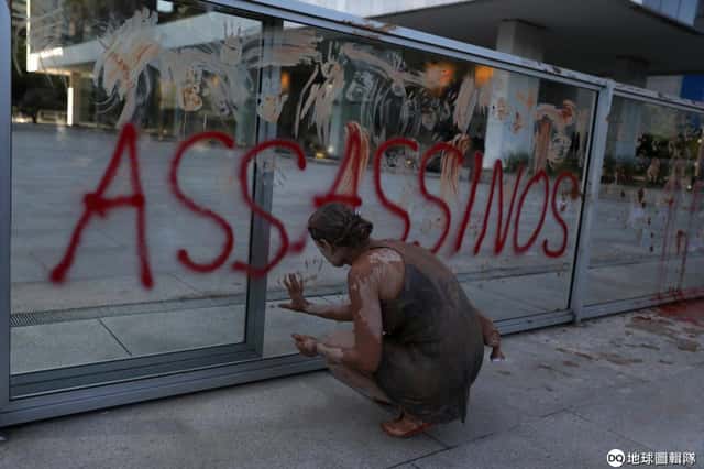 在淡水河谷礦產公司(Vale S.A.)的大門前,不滿的示威者塗上泥巴在此抗議,並在玻璃圍欄上寫下大大的「兇手」紅字。