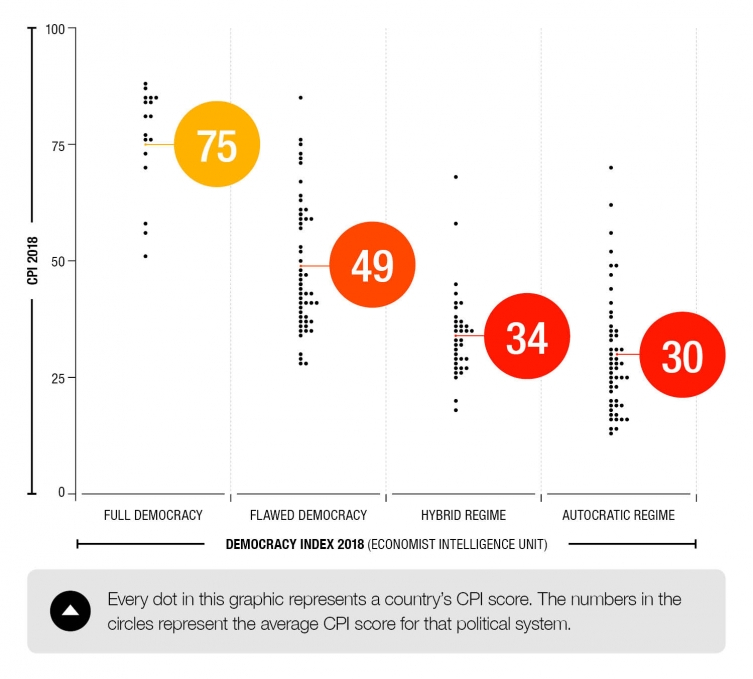 在這次的報告中,國際透明組織進一步把清廉印象指數和全球民主健全狀況進行交叉分析,後者的資料是來自美國非營利組織「自由之家」,他們用來衡量民主健全與否的標準,是根據這個國家是否有自由且公平的選舉、獨立且具影響力的政府機構、人民擁有參政權(像是可以上街示威)與公民權(能夠接受公平審判)。研究發現,民主越健全的國家,其人們對自身政府的清廉印象就越高。