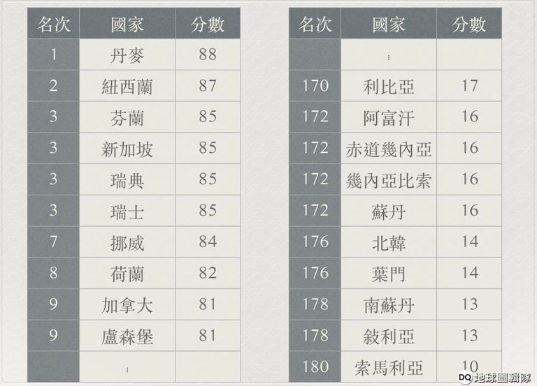 昨日(31),非政府組織國際透明組織(Transparency International, TI)公布了 2018年的清廉印象指數大調查(Transparency International Corruption Perceptions Index, CPI),在 180個國家中,丹麥和紐西蘭持續佔據排名中的前兩位,芬蘭、新加坡、瑞典、瑞士則以相同的分數位居第三,北韓、葉門、南蘇丹、敘利亞、索馬利亞則為倒數第五。台灣則在第 31名。