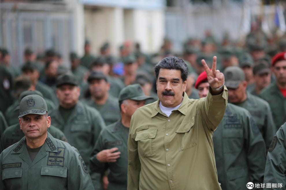 在首都卡拉卡斯的軍事基地,委內瑞拉總統馬杜洛(Nicolas Maduro)對著鏡頭比出勝利手勢。