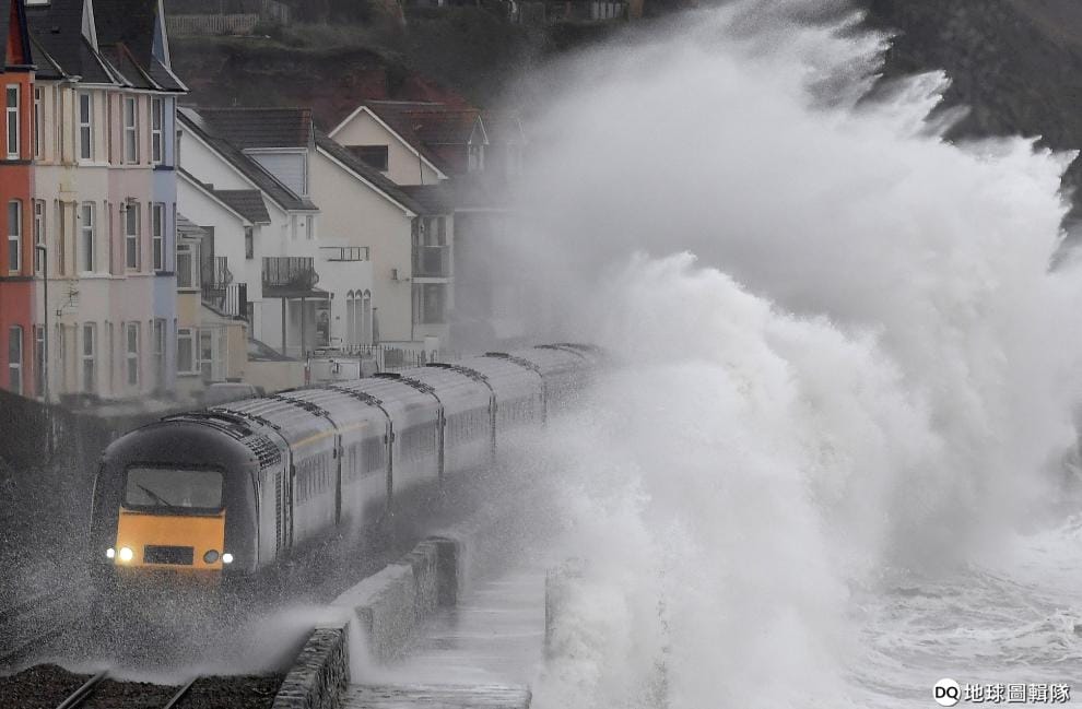 在英國南部沿著海岸修築的鐵軌,一道大浪打在行進中的火車上。