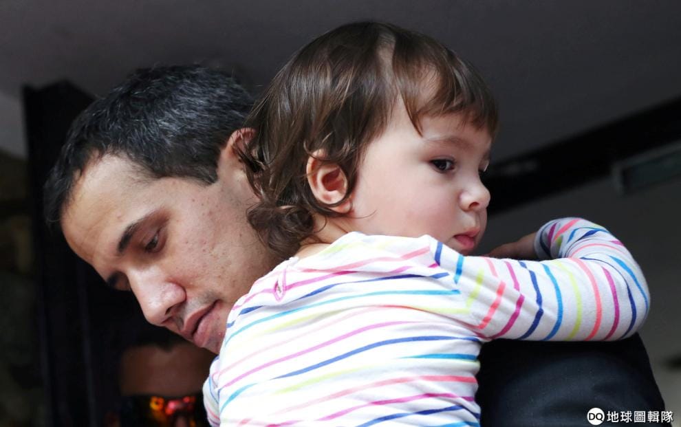 在首都卡拉卡斯,剛和支持者討論完臨時政府計畫的反對黨領袖兼臨時總統蓋多(Juan Guaido),抱著女兒站在家門外。
