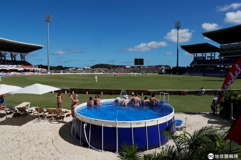 在加勒比海上的中美洲島國安地卡及巴布達,人們待在泳池裡觀看板球賽。