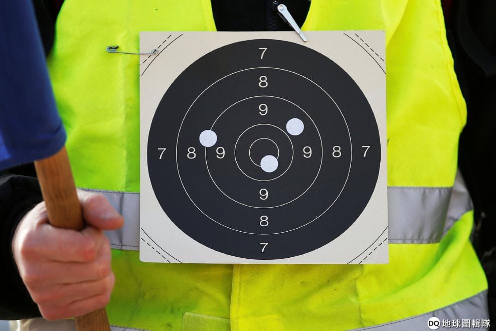 在黃背心抗議現場,一名示威者把靶心圖別在身上,向政府當局表達不滿。
