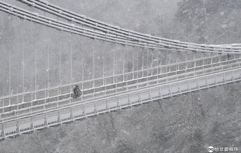 在大雪紛飛的當口,畫面中的人正不畏寒風地騎著腳踏車橫越克利夫頓吊橋(Clifton Suspension Bridge)。