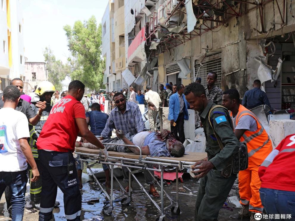 在首都摩加迪休(Mogadishu)的購物商場發生汽車爆炸事故後,救難人員正忙著撤離傷者。整起事件造成 11人死亡、10多人受傷,且疑似是激進組織青年黨(al-Shabab)所為。