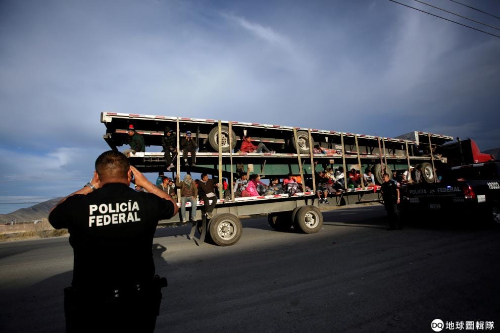 在城市薩爾蒂約(Saltillo),一輛載著移民、準備前往美國的貨車在被警察攔下後,現在準備要被送往臨時庇護所。