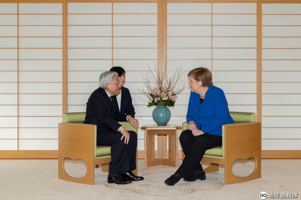 在這張由日本宮內廳發布的照片中,德國總理梅克爾(Angela Merkel)正在和日本明仁天皇交談。