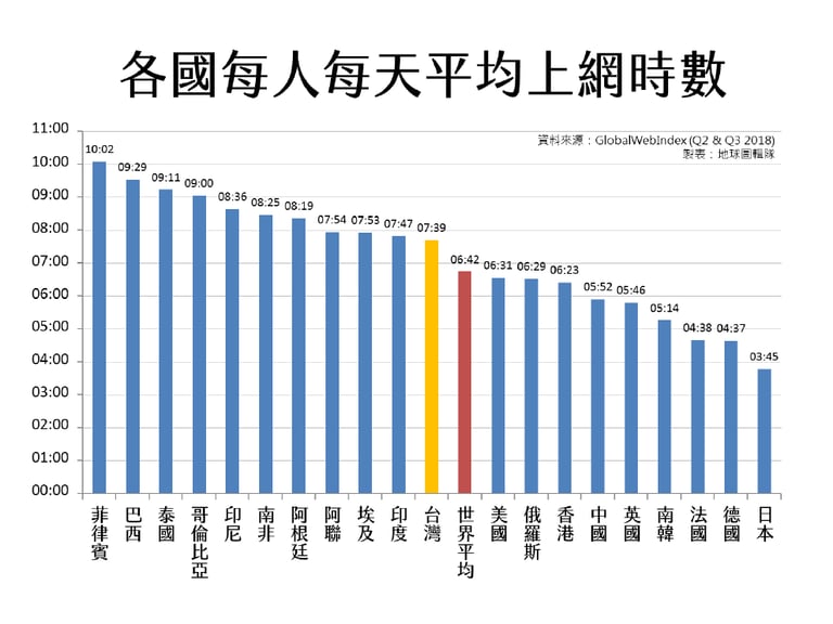 而台灣人的每日平均上網時數為 7小時49分鐘,屬於上網時數較長的前段班。