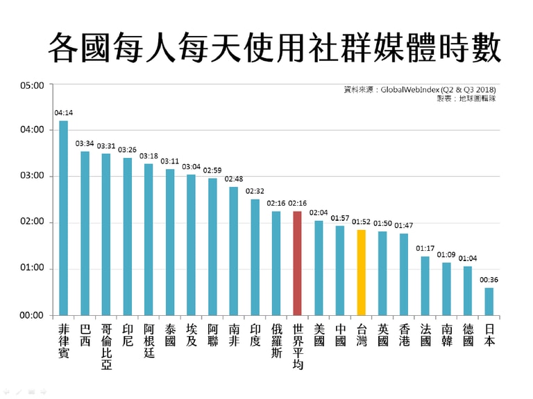 調查結果顯示,正如同各國民眾每天投入在網路上的時數一樣,在全球每人每天平均花費在社群媒體上的時數為 2小時16分鐘的情況下,菲律賓人以 4小時12分鐘位居榜首,日本則是以每天只有 36分鐘墊底。