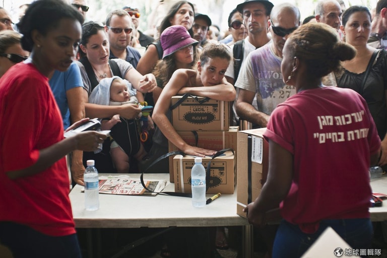 照片中是以色列的民眾,他們正排隊搶拿防毒面具