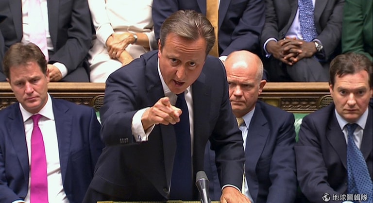 照片中是英國首相卡麥隆,他在國會中與議員們激烈辯論