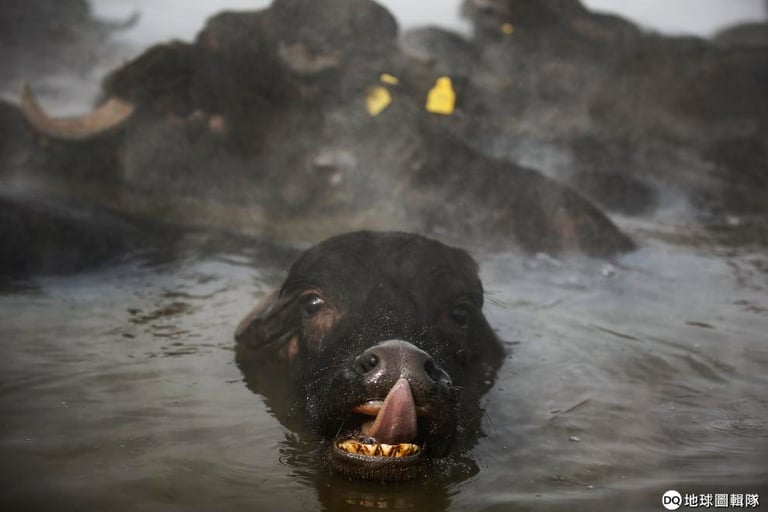 事實上,水牛們早就熟門熟路,等著泡在熱氣蒸騰、攝氏 40度的溫泉裡暖和一下,牧牛人要把牠們趕出溫泉還得花上好一番工夫,才能讓對溫泉戀戀不捨的水牛回家。