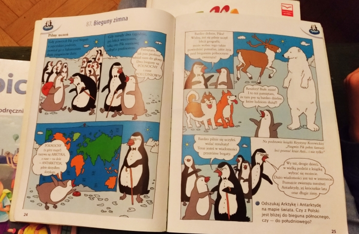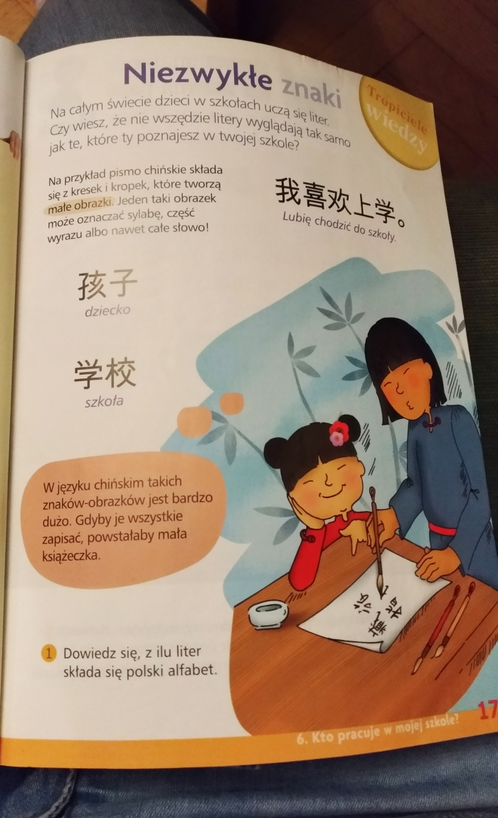 另外,令我相當讚賞的是,課本中也討論世界上各洲和各國的文化。例如,其中一頁居然出現了中文! 這一頁說的是:小朋友,世界上所有的孩子都學寫字,但你知道世界上有些文字看起來和波蘭文不一樣嗎?