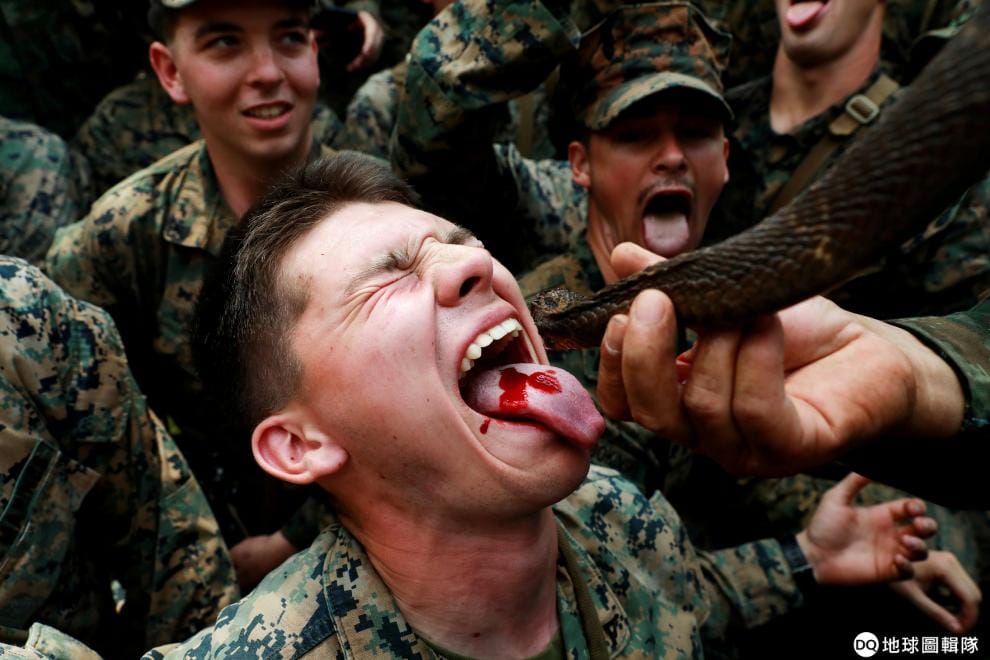 在泰國春武里府的叢林,好幾名士兵正在輪流進行喝蛇血的生存訓練。