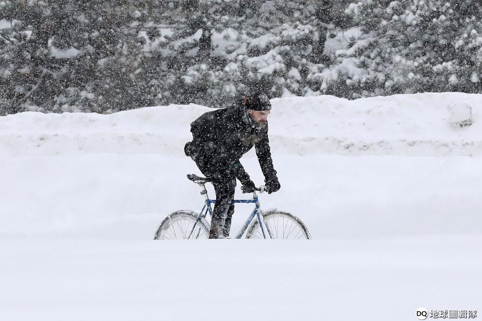 一名男子不畏風雪交加,依舊騎著腳踏車出沒在渥太華街頭。