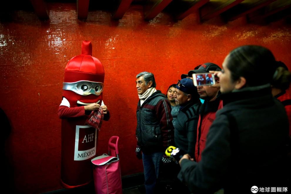 適逢國際保險套日,一名打扮成保險套的女子在地鐵站發送免費的保險套,提醒社會大眾安全性行為的重要性。
