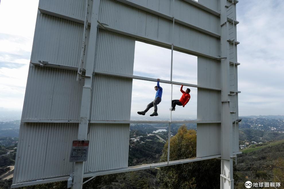 在這張拍攝自本月 1號、並在近日公布的照片中,記錄下攀登員霍諾德(Alex Honnold,左)與紀錄片《徒手攀巖》的導演金國威(右)一同爬上好萊塢山(Hollywood Hills)的經典標誌「Hollywood」的模樣。