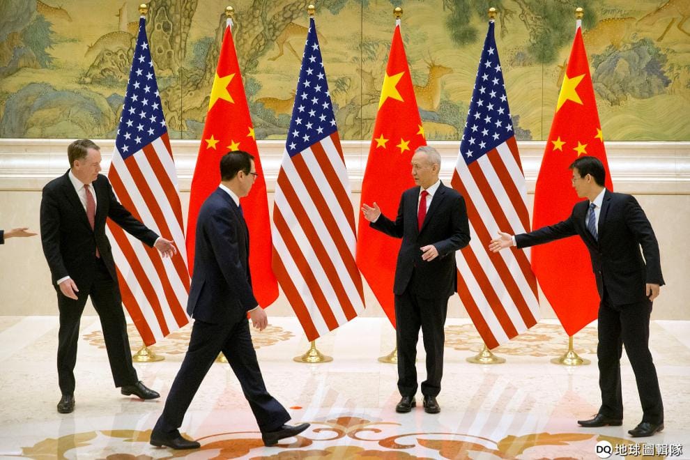 美國貿易代表萊特海澤(Robert Lighthizer)與中國國務院副總理劉鶴準備在美國與中國的國旗前合照,稍後兩國就要展開貿易協商了。