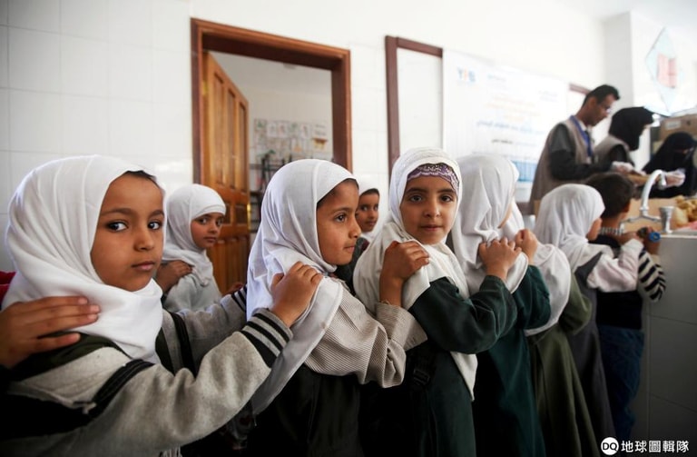 在首都沙那(Sanaa)的一間學校裡,女學生們排隊領取慈善組織提供的餐食。