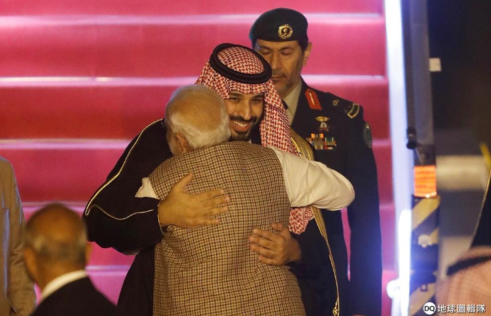 在新德里國際機場,印度總理莫迪(Narendra Modi)給遠道而來的沙烏地阿拉伯王儲沙爾曼王子(Crown Prince Mohammed bin Salman)一個大大的擁抱。