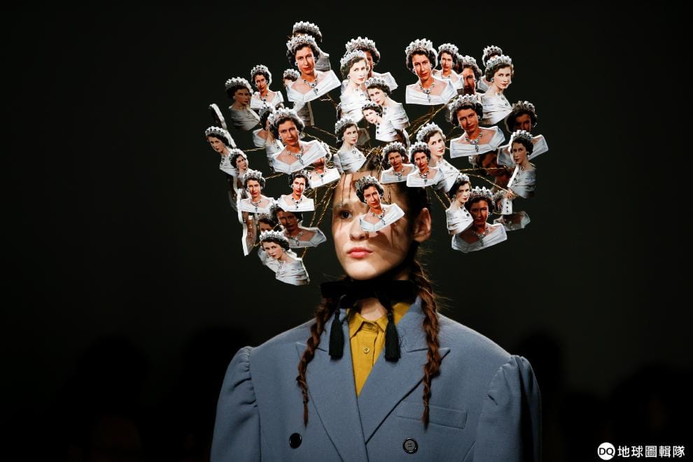 在倫敦時裝周上,南韓服飾品牌pushBUTTON推出了他們的最新設計。其中,一名模特兒頭頂著英國女王伊莉莎白二世(Elizabeth II)的各種風情走上伸展台。