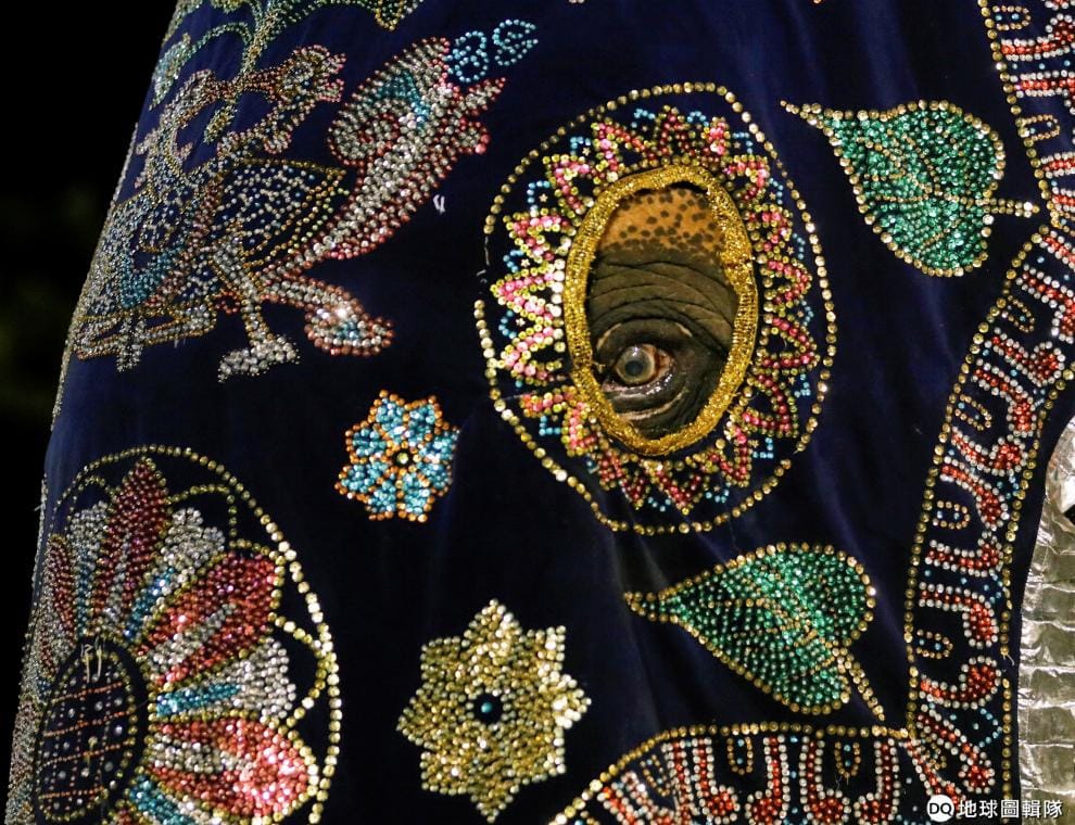 在首都可倫坡(Colombo)的Gangaramaya佛寺,一隻裝飾華麗的大象準備參加滿月慶典。