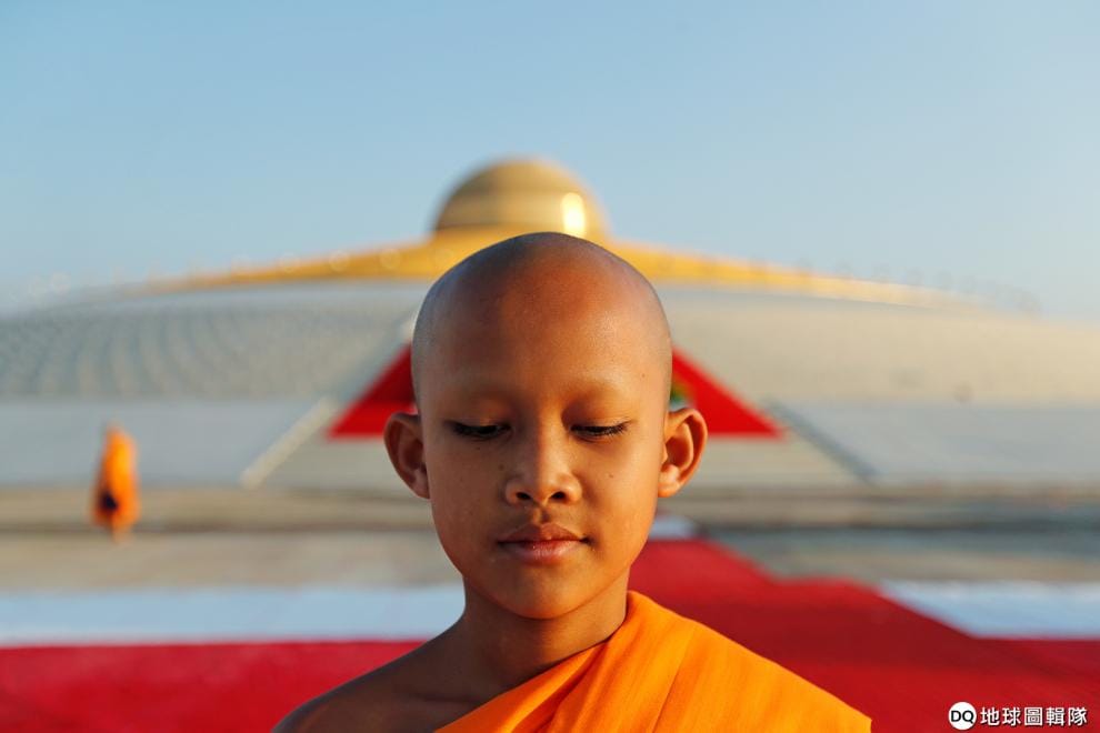 在曼谷北方的法身寺(Wat Phra Dhammkaya),一名小沙彌正在祈禱,希望待會舉行的萬佛節(Makha Bucha Day)能夠順利。