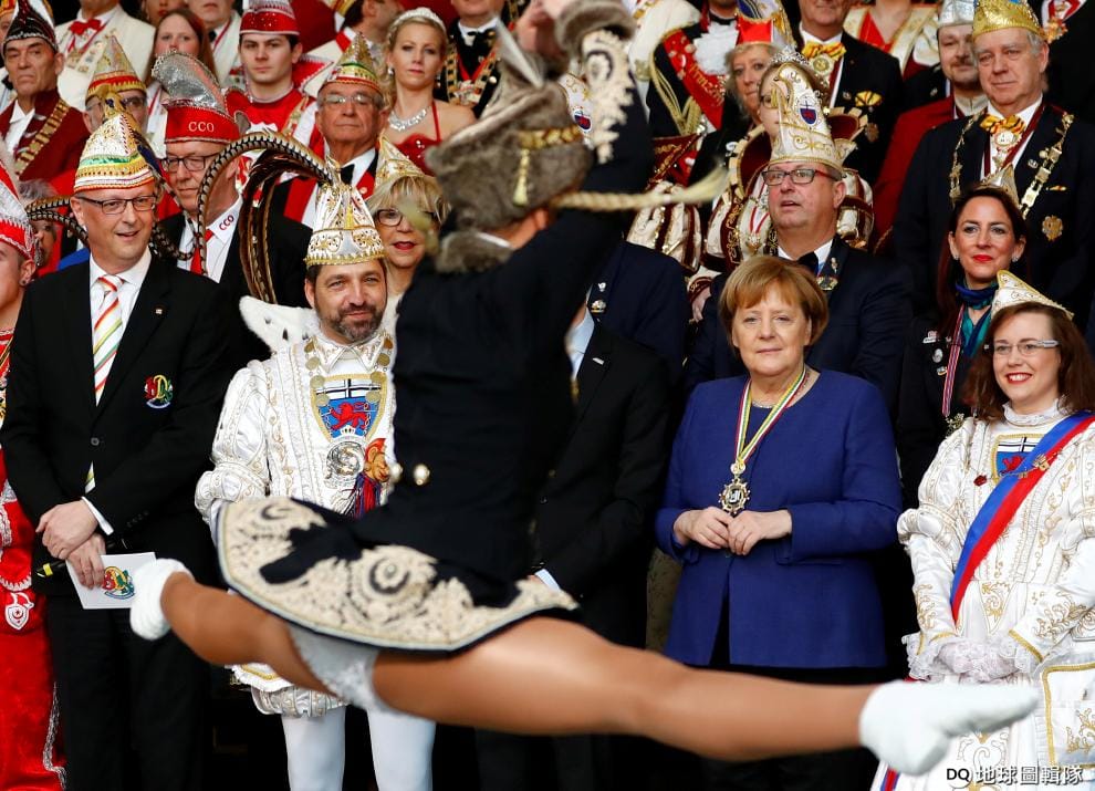 在位於柏林的德國總理府,德國嘉年華團隊的成員在總理梅克爾(Angela Merkel,藍衣者)獻上歡樂的表演。