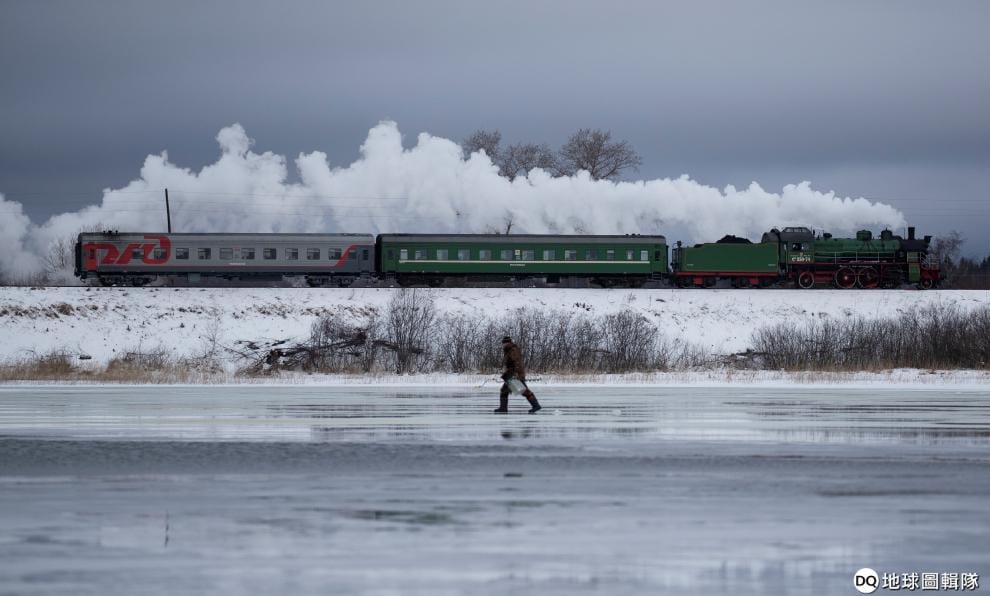 在東歐平原中部的特維爾州(Tver region),一輛蒸汽火車緩緩開過結冰的水壩。