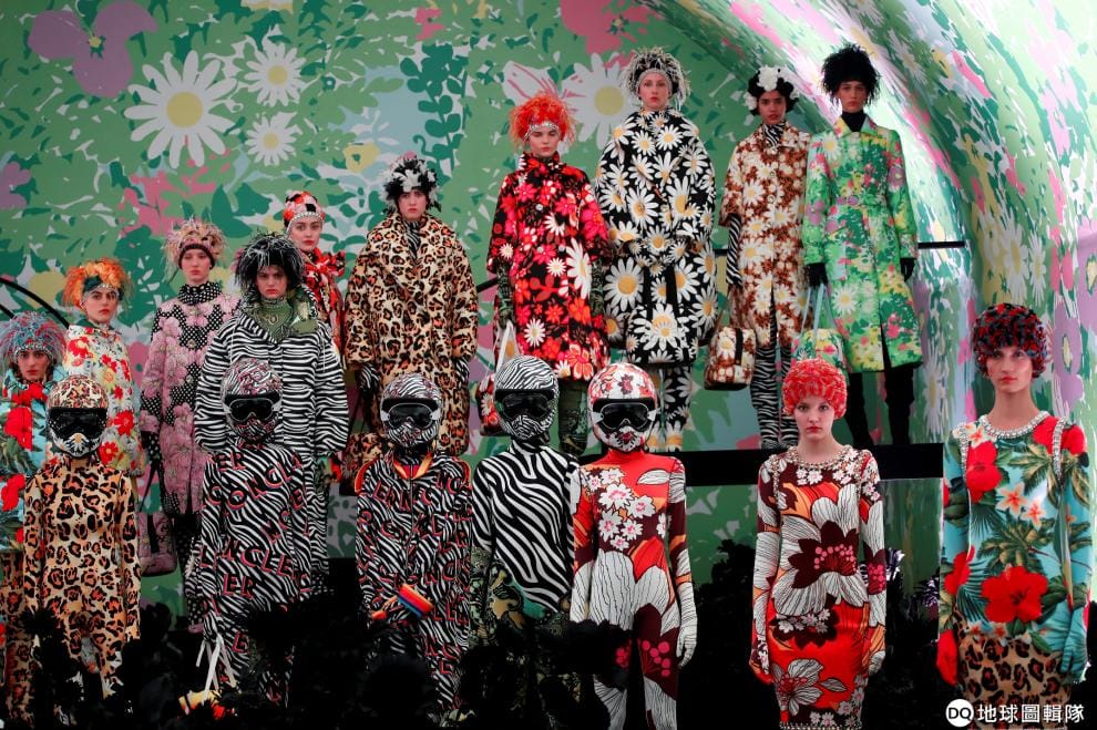 在米蘭時裝周上,穿多位模特兒穿上服裝品牌Moncler Genius的設計,在伸展台上展示該品牌的大膽奔放。