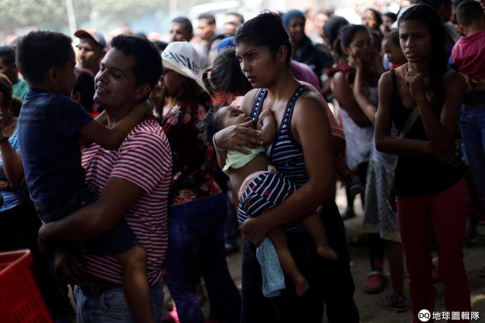 在哥倫比亞與委內瑞拉交界的庫庫塔市(Cucuta),逃出委內瑞拉的移民在庇護所前排隊等待領取免費午餐。