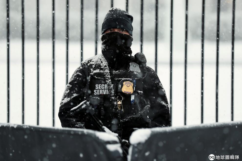 在華盛頓特區的白宮前,一名美國特勤局人員在大雪中值勤。