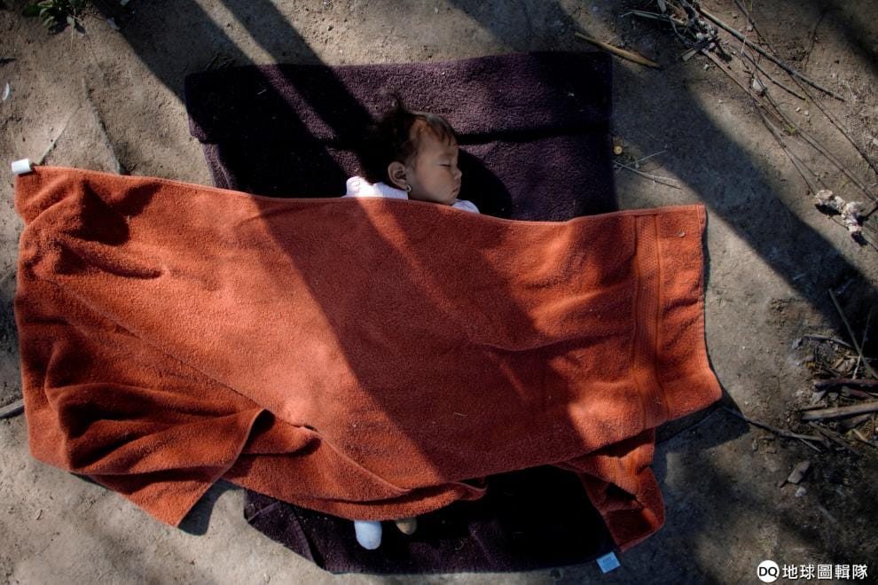 在美墨交界的布拉沃河(Rio Bravo)岸邊,今年一歲的帕雷(Mia Paulet)安穩地躺在地上睡覺,儲備接下來跨越邊境前往美國的體力。