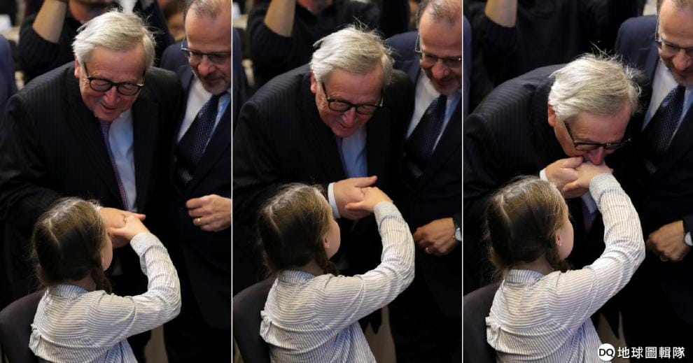 在布魯塞爾舉辦的環保會議上,歐洲聯盟執行委員會主席榮科(Jean-Claude Juncker)向今年 16歲的瑞典少女環保鬥士通伯格(Greta Thunberg)致意。