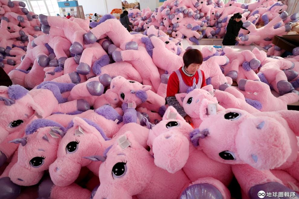 在江蘇省連雲港市的一座玩具工廠裡,工人們忙著製作粉紅色獨角獸填充玩具。