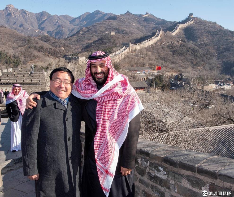 在北京郊外的萬里長城,沙烏地阿拉伯王儲沙爾曼王子(Crown Prince Mohammed bin Salman)和中國駐沙國大使李華新合照。