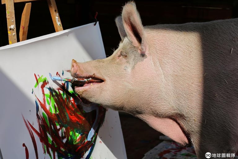 在南非第二大城開普敦(Cape Town)近郊的農場動物庇護所,一隻被從農場中救出來的豬正在揮灑才華,牠也靠著天生對美術的敏感被封為「豬卡索」(Pigcasso),和西班牙抽象畫大師畢卡索(Pablo Ruiz Picasso)只差了一個字。