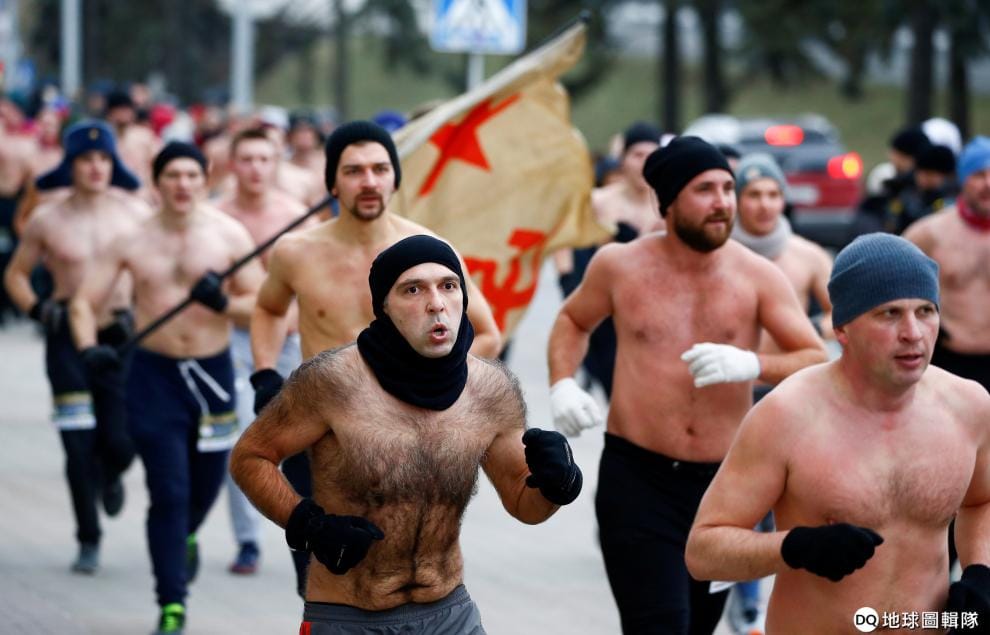 時逢祖國保衛者日(Defender of the Fatherland Day),一群參加者打著赤膊,準備來場「真男人賽跑」。