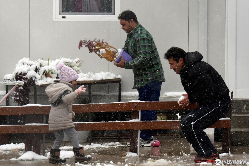 在位於東北部城鎮季亞瓦塔(Diavat)的移民帳棚裡,和大人玩起雪仗的小孩顯得不亦樂乎。