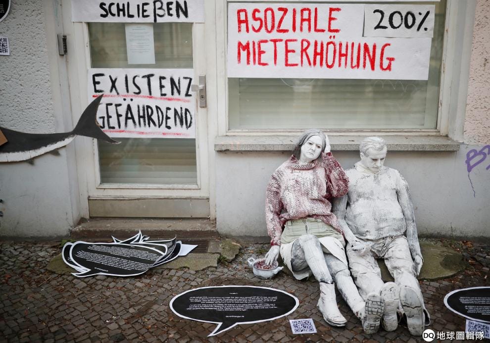 在柏林東部的腓特烈海因(Friedrichshain)區街頭,等身大的人偶被擺在正在出租的房屋外頭,對當今房租上漲、都市發展仕紳化(gentrification)的柏林現況表達不滿。