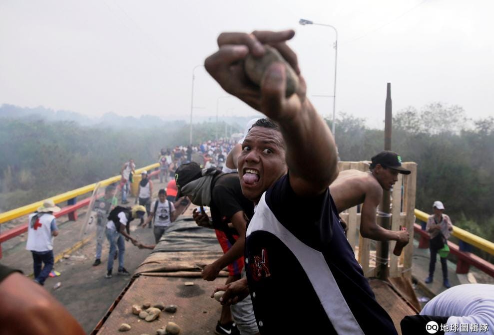 在連接著委內瑞拉和哥倫比亞的跨國大橋上,反對勢力的支持者朝委內瑞拉維安部隊扔擲石頭,希望他們可以盡快解除封鎖,好讓救援物資能送進委內瑞拉。